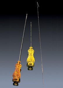 Dispositivo de biópsia descartável para tecidos moles, com calibres identificados por cores.